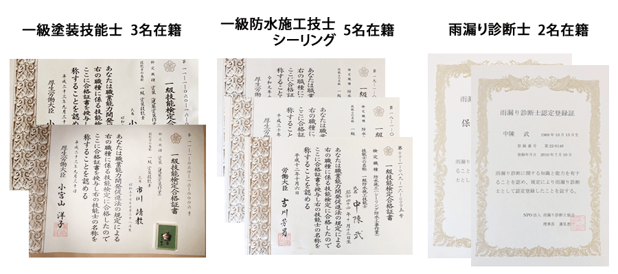 また、代表の私が職人なので、私自身シーリング一級技能士や雨漏り診断士を保有しています。塗装職人も一級塗装技能士や二級塗装技能士の資格を保有しています。