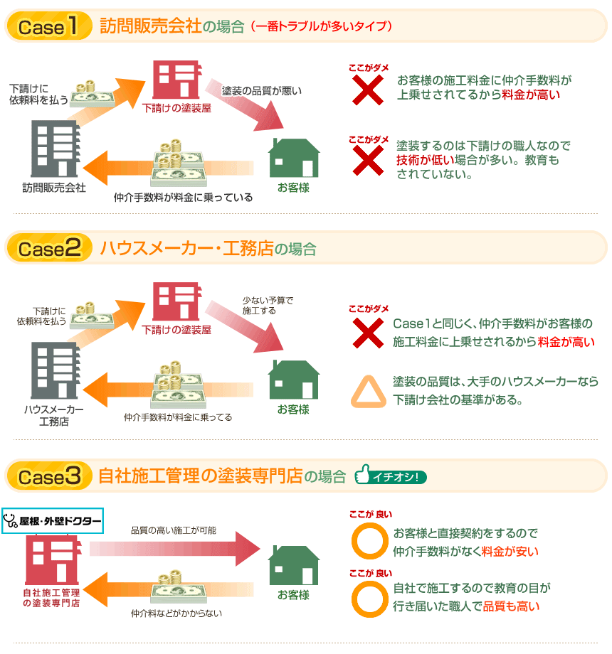 「ハウスメーカー」「工務店」「訪問販売会社」「リフォーム総合店」などの注文先があることをご存知でしょうか?塗装専門店以外は、自社に塗装職人がいないことがほとんどで、仕事を受注すると下請けの塗装店に仕事を投げることがあります。