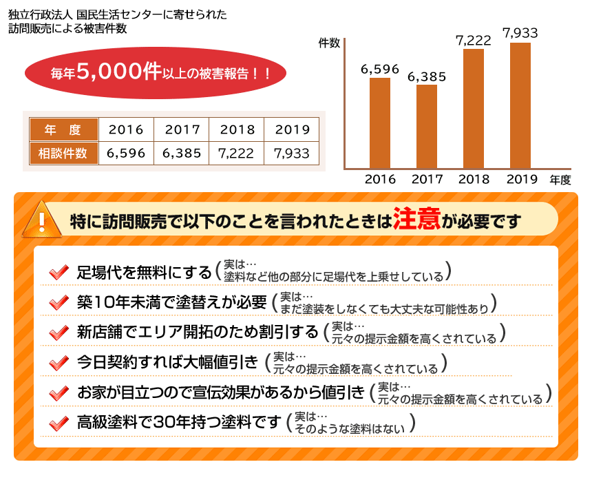 訪問販売の会社が来て以下のことを言われた場合は注意が必要です。訪問販売の全てが悪い業者ではありませんが、トラブルが多いのは事実です。