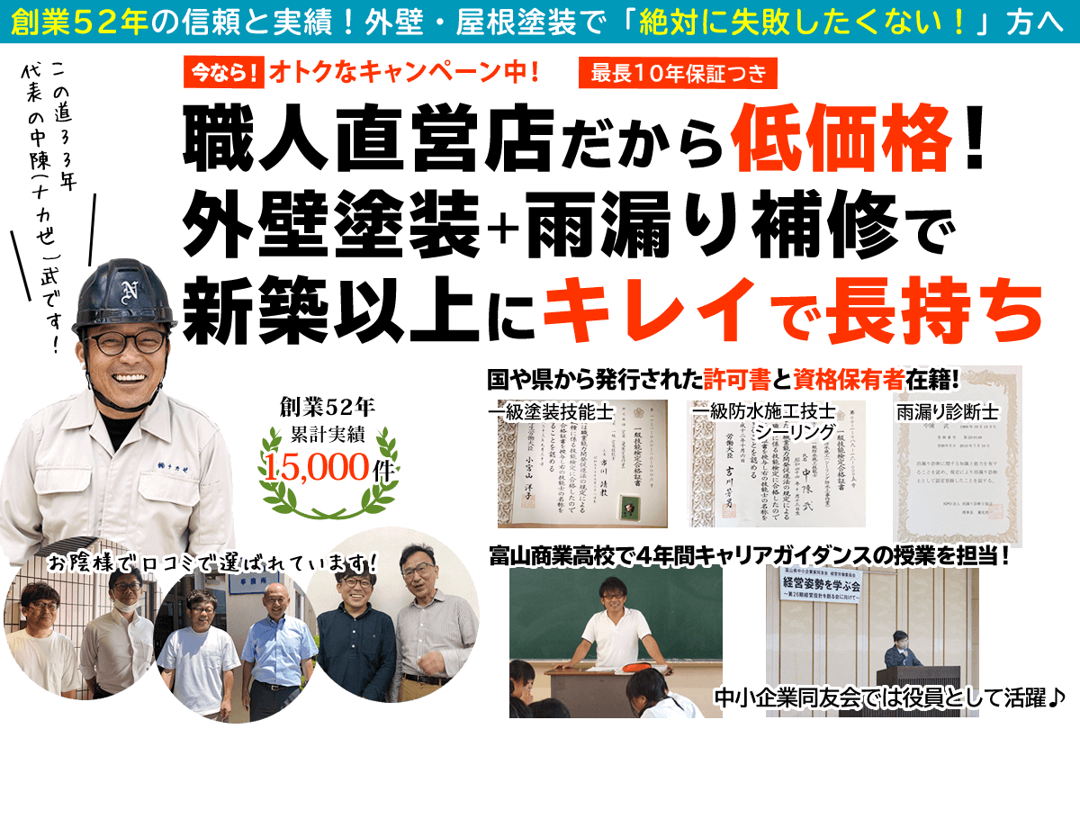 私どもは地元で50年以上の実績があり、富山県の住宅に関する知識があります。そのため、ただ塗るだけの塗装店と違い長持ちさせることができます。